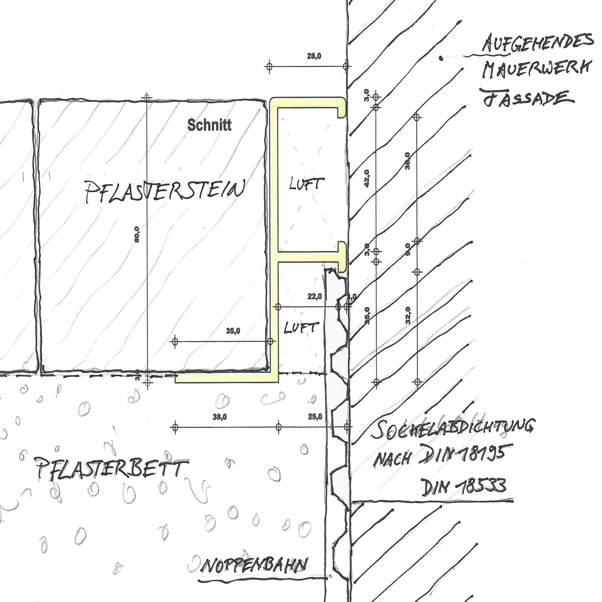 Profil und Verlegebeispiele am Randanschluss und Sockelanschluss für Betonpflaster